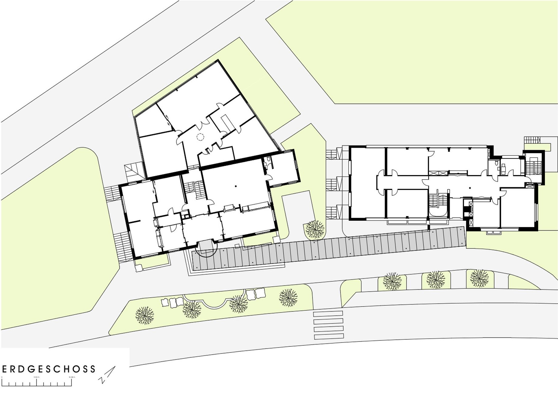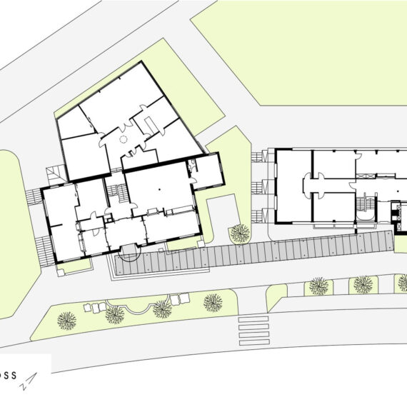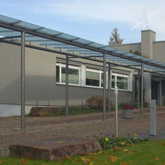 Als Verbindung beider Gemeindehäuser wurde eine neue 40 m’ lange Glas/Metall-Überdachung realisiert, die als optisches und funktionales Gelenk beider Gemeindehäuser dient.